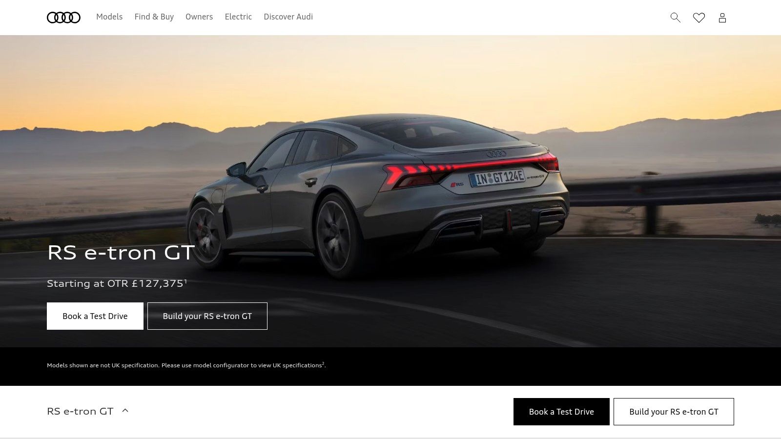 Audi UK – RS e-tron GT | Moderate: Detailed configurator & dealer sales | High dealer engagement | High-performance data; finance details | Performance EV buyers seeking Audi RS e-tron GT | Excellent performance; AWD; clear finance options |