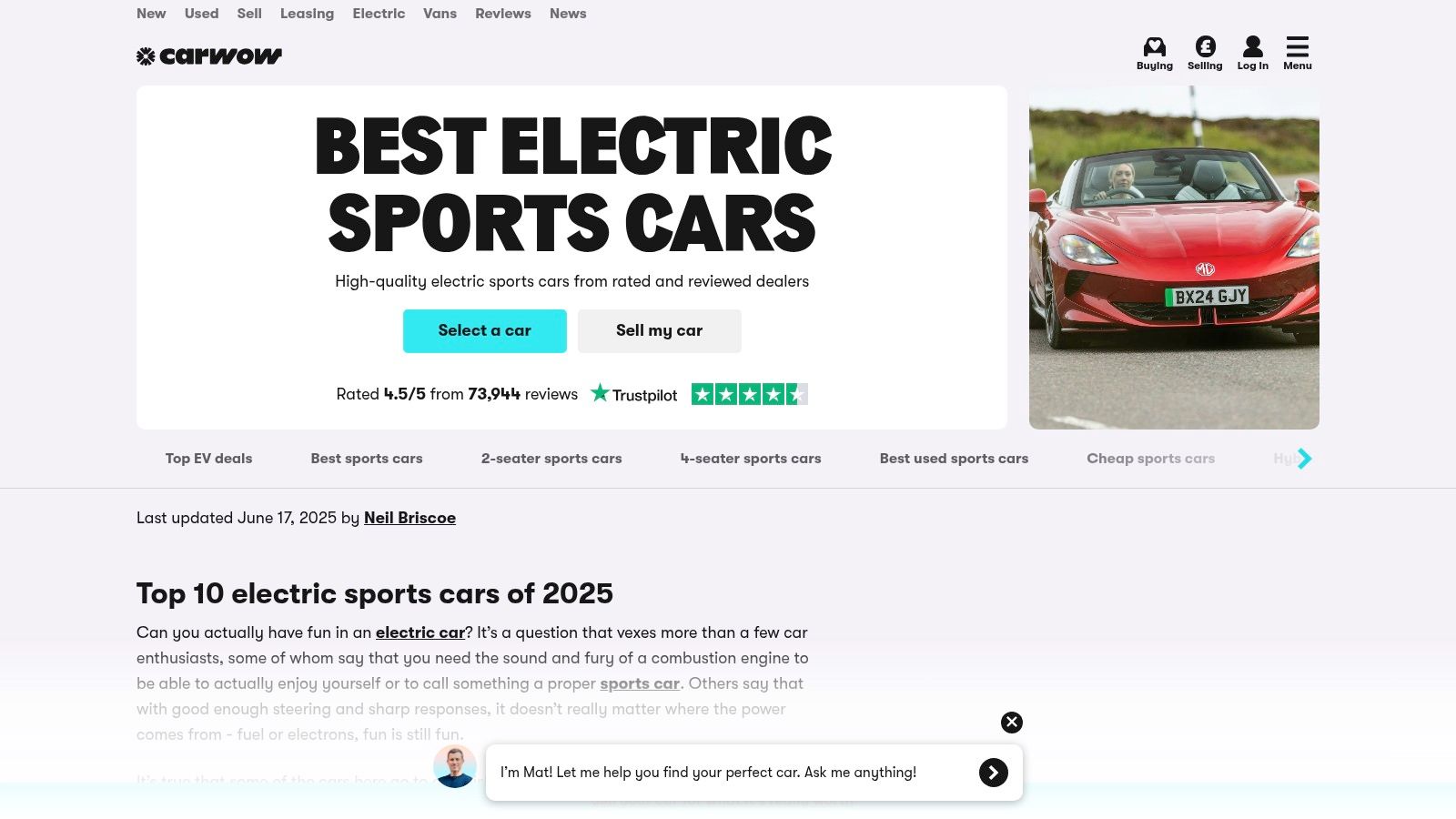 6. carwow UK – Electric sports cars (comparison, reviews, and quotes)