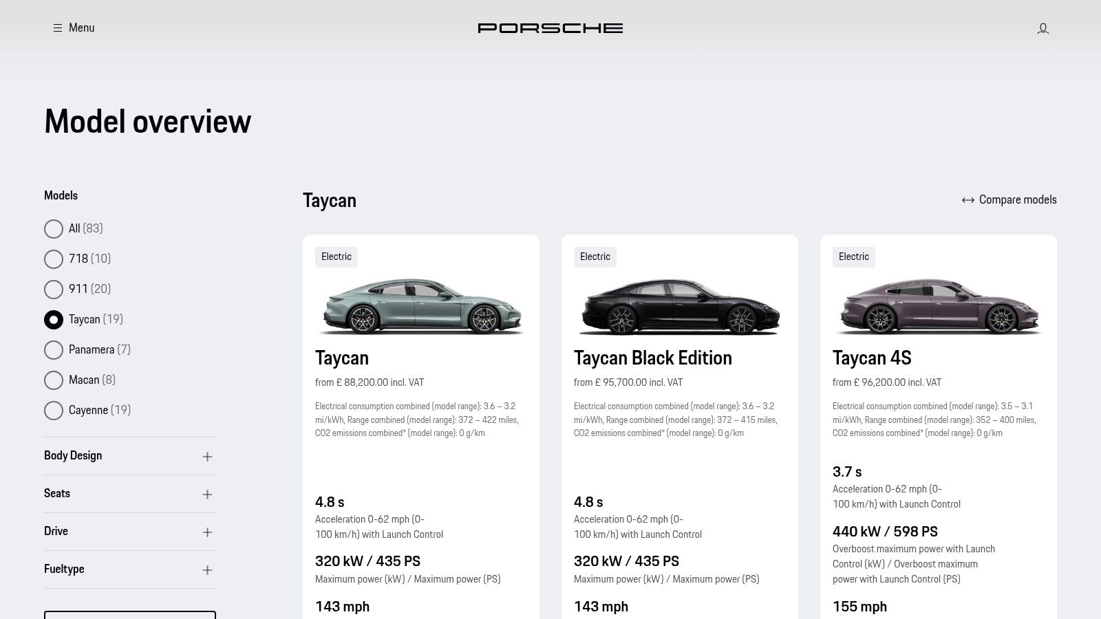 Porsche Great Britain – Taycan | Moderate: Online configurator, dealer-based final sales | Dealer networks, finance partners | Accurate pricing and specs; performance insights | Buyers researching and customizing Taycan | Up-to-date specs; clear options; performance comparison |