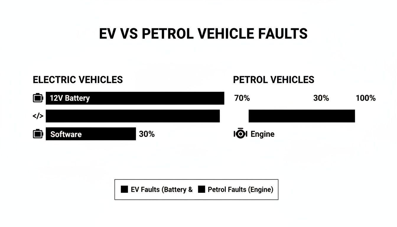The following chart breaks down where the most common faults lie for EVs versus their petrol-powered predecessors.