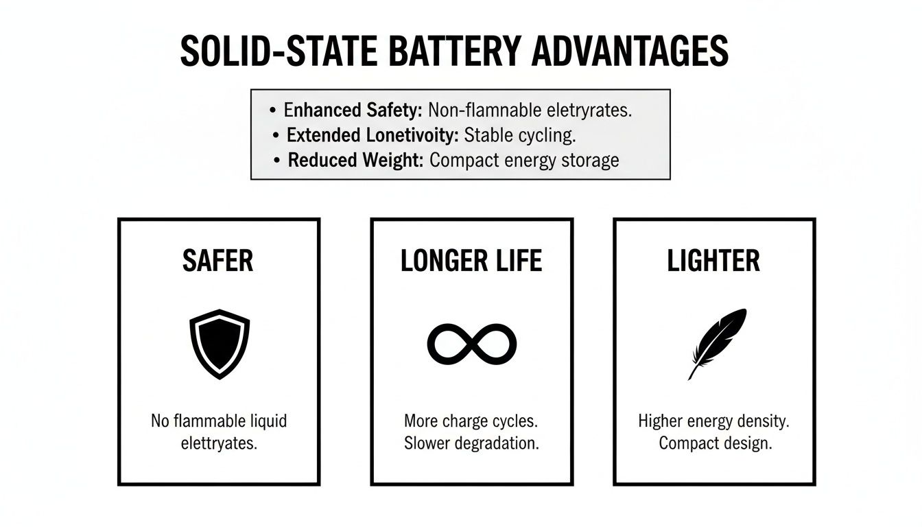 This natural stability also means they have a much longer life. A solid-state battery is expected to handle far more charge cycles than its liquid-filled cousin, meaning it could easily outlive the car itself. That’s great news for resale values and peace of mind about expensive battery replacements. To see how this fits into the bigger picture, have a look at our deep dive on the latest innovations in electric vehicle battery technology.